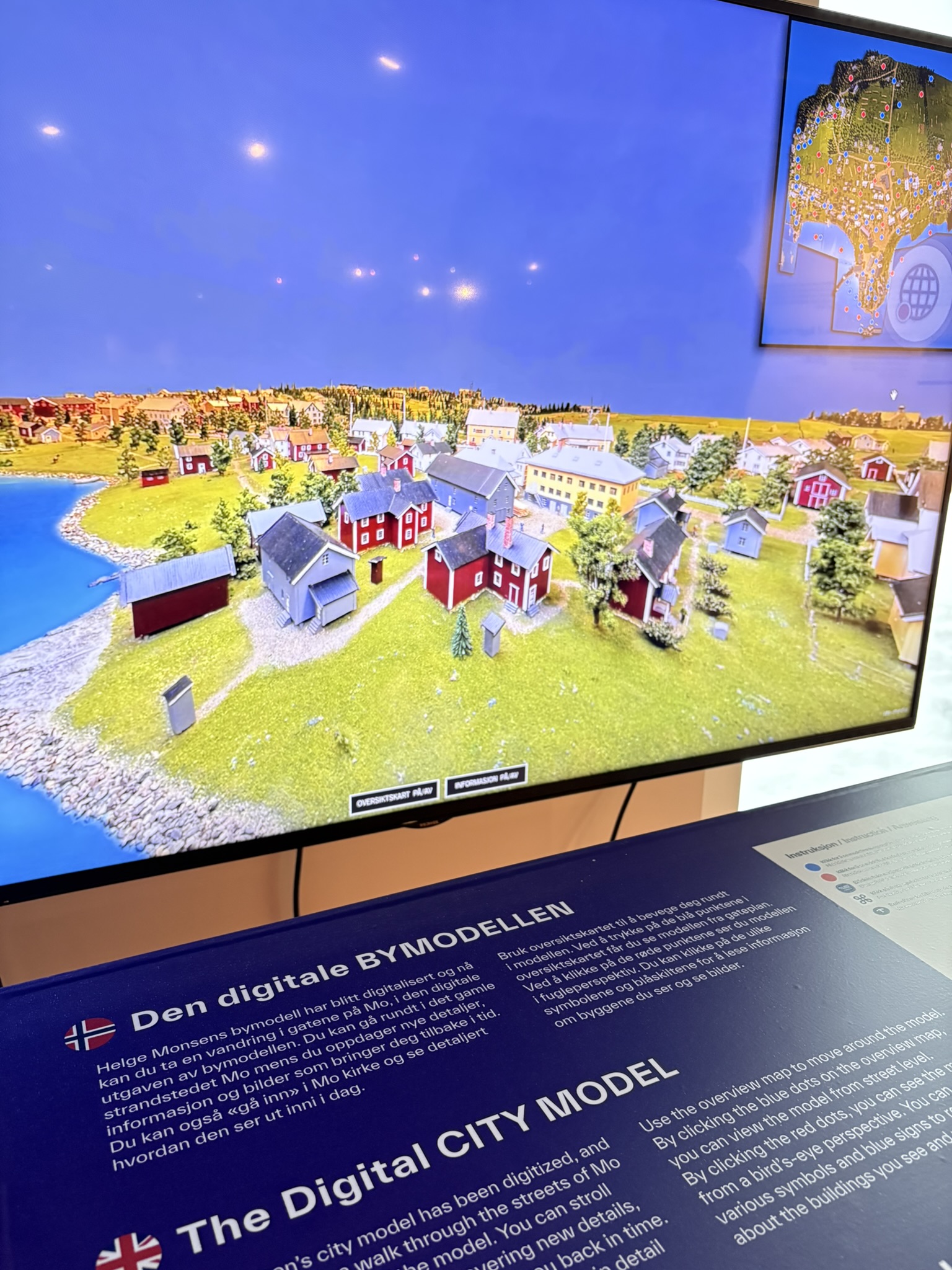 Bymodellen er en oppbygging av det gamle strandstedet Mo i målestokk 1:100, og representerer bebyggelsen i tiårene mellom 1920 og etterkrigstid. Modellen er et imponerende stykke håndverk på drøye 80 kvadratmeter laget av Helge Monsen (1928-2016). Vi har utstilt en liten del av bymodellen og i den digitale utgaven av bymodellen kan du reise tilbake i tid og gå i gatene til det gamle strandstedet. Her møtes tradisjonsrik håndverks kunst og moderne teknologi, og synergien gjør lokalhistorie tilgjengelig på en måte som er tilpasset et yngre publikum.